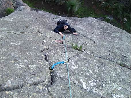 I jumped on the first line a great cracked slab, which provided beautifully sustained climbing. Graded at 15 it felt a fair bit harder but that may have been due to the rock being so cold, making our fingers tingle and toes ache: