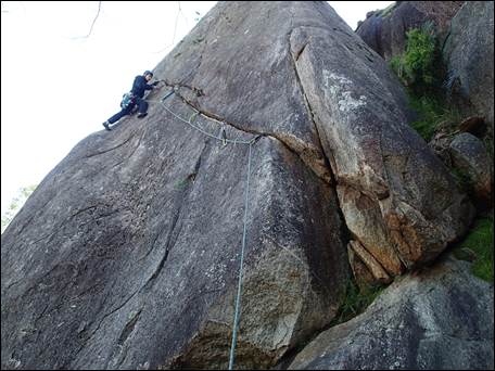 He was soon heading up yet another great line, a grade 13 leftward rising traverse that girdled the whole crag. It had some airy moves in great positions and left some of the best moments till last when the rope drag was greatest (Chris probably not even half way in this image):