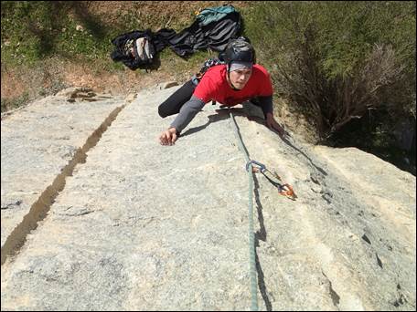 Next I jumped on a grade 17 slab, the description of which said it was a bit run out in the middle. I didn’t have too much trouble other than a screaming calve muscle, and relished the thin exposed moves. As Chris followed me up he was showing signs of tiring:
