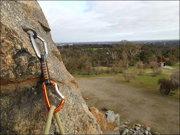 We decided however to start on something less steep, to get used the rock and allow us the time to wake up. However, the guide we had was some 20 years old so didn’t have even half the routes we could see, but we plumped for a fun looking slabby pillar that had three lines going up it. I set off first as Chris hadn’t touched rock much over the last few months, so was the first to clip the bolts. As I worked my way up I got a view of the outer areas of Perth which included some residential but also a mob of industrial areas criss-crossed with power lines:
