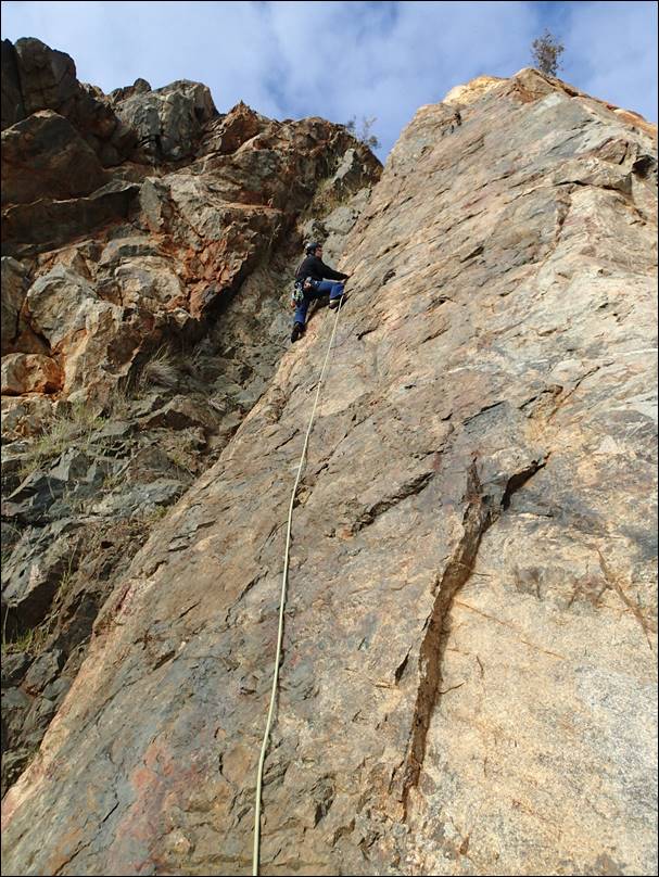 It was really starting to warm up as the clock was heading towards midday, so only a quick stop for a bite to eat before we went for the next line. This one looked the least intimidating of the lot so far but was in full sun, a mixture of short walls and slabs proving to be yet another fun line. Yes there is finally a photo of me, heading up after Chris led it: