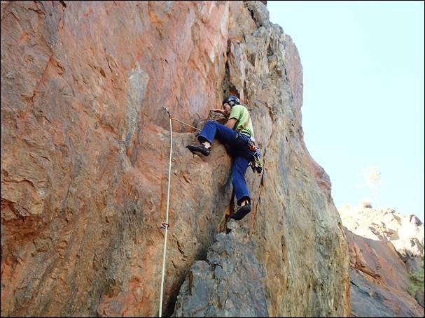The sun was beating down now so we wandered over to look at a few other lines in the shade A few other people had been playing on one climb earlier in the morning. They had to bail and rap down to get their gear so we guessed it was tricky, but looking at it is didn’t look appealing. So I went for the great looking open book corner that has a superb looking line of thin flakes up the guts of it. The line was pumpy and sustained, with a great thin finish which I felt I was about to slip off at any moment. We both loved the line and were starting to get to like the place more and more.