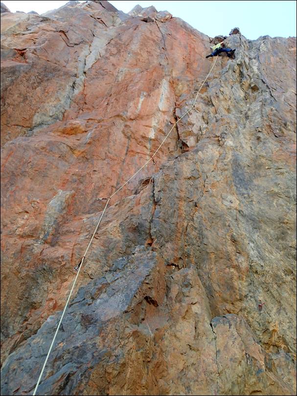 Chris was slow on second and not feeling it. But for anyone who climbs with me should know that it is not that easy to get out of leading one for one, so up he went on the left side of the pillar. The rock is hard but also brittle and there was evidence of many flakes and sizable chunks littered all around. You needed to check the holds as you used them and for the most they were good, but occasionally you felt something creak and it was enough to make us that bit more cautious on the first few ascents we did:
