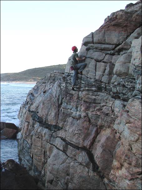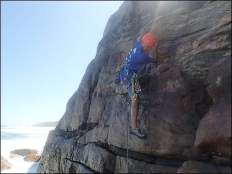 As Lou followed me up she seemed more concerned about the crashing waves than the moves on wet rocks. It was a fine climb to end the days relaxed morning on trad: