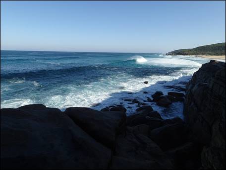 It was forecast to be in the high 20s today, but for now it was still cool. As the waves rolled in they left a mist in their wake, which was drifting towards the shore as the rock was wet. But not wet enough to dampen our spirits: