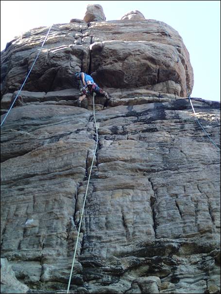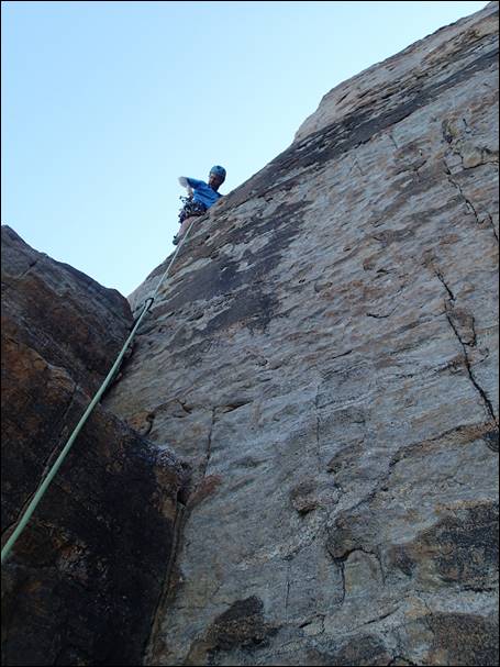 Five routes in and going well, so next up we headed for a two pitch climb called Sirius, with both pitches going at 14. As Mikie was on the first traverse pitch someone was lowering a rope down the wall and low and behold Kym popped up. It seems Kym was jilted by young Tom who was instead heading out with Logan Barber later that day (bit of name dropping there if you didn’t notice, but also a little update on just how well Tom’s climbing is going):