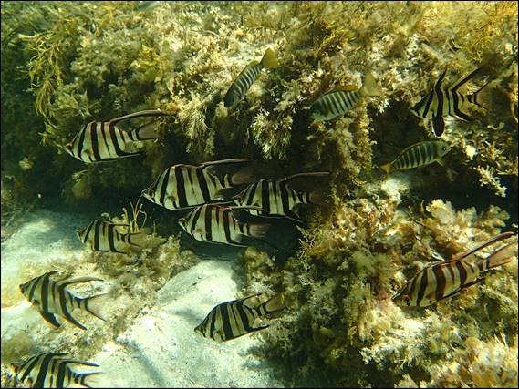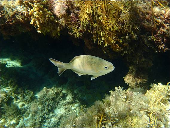 There was one open sandy area that was deeper and in this there were hundreds of fish milling about and it felt like a huge aquarium. A couple of species I’ve identified are the Western Pomfred and Southern Silver Drummer but there are many others both in this image and not that I have not. There are simply too many species of fish in the sea(!):