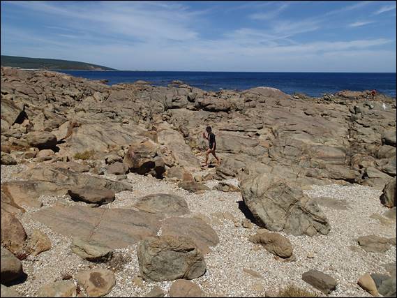 As we supped our brews and warmed up both from the inside and outside we strolled along the rocks to watch the gentle waves and admire the coastline. That is code for Lisa finding the perfect rock armchair and me rock hoping about to see what I might find: