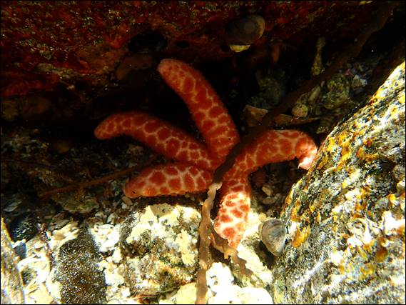 I was not to be disappointed and after much wandering about checking out rock pools I stumbled across this beautiful sea star. I’ve tried to find out which one this is and the best I can come up with is a possible a species of Fromia, but most of the ones I’ve found are either red’ish all over or more white spots on red. But after spending over an hour and half pouring over our fish and coral reef books and the website to write this email I give up. If Mikey and Helen can once again help me out that would be great!