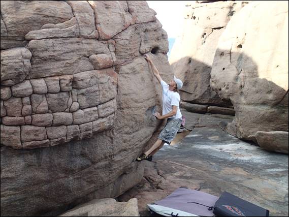 Today, while the rock pools still had water in them, the shelf was high and dry and the rock was also in perfect condition. It’s a place with slopers and smears so the rock condition is critical, and we really couldn’t have picked a better day. We warmed up on a few easier problems to get used to the rock and style. Kym has been here a few times so I was following his lead and we started on two V1s next to each other called Supplies! and Dolphinius: