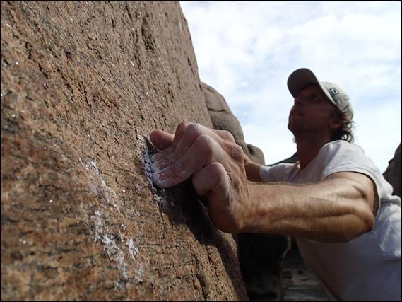 It was then time to get really silly starting with this nasty V8 finger crack called Claw of the Crab. Needless to say we didn’t get it, and Kym at least managed to get his feet onto the break at which his right hand is at. After that it was hard to figure out what to do next, the crack gave a wicked finger lock but the thought of falling on it was worrying: