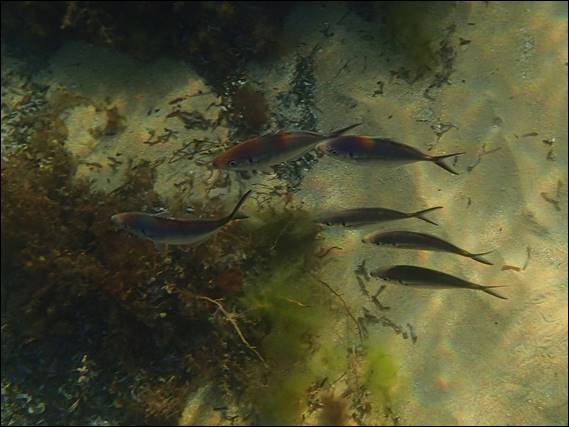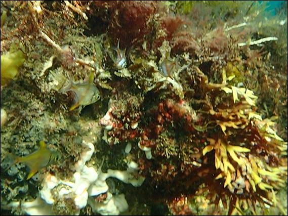 There were also lots of little fish but they are so hard to capture in a photo probably more because I can’t hold my breathe long enough to allow them to get used to me floating next to them. Still I couldn’t resit including this blurry photo of some small Western Pomfred, only being an inch or so long: