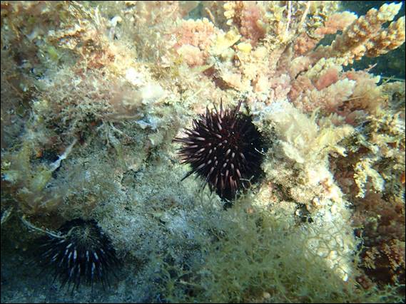 There are spots there is a small reef along Peppy and in the nooks and crannies there are always things to be found, today it was the Strongylocentrotus purpuratus (Purple Sea Urchin). There distinctive pale spines is what gives them away, and I’m not sure if they find holes to live in our burrow into the reef, as each time the homes I find them in are a perfect fit: