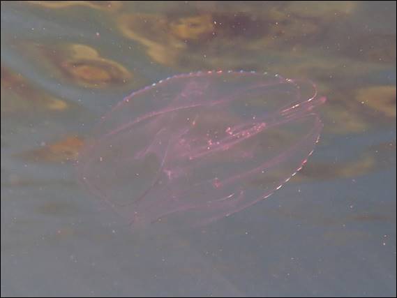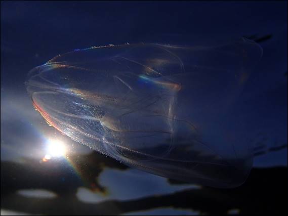 By now I was getting cold and had to head back to shore, but not before a few more Jellyfish images. I have now worked out that these are part of the Ctenophores family and are probably Comb Jellies. It is great watching these guys and the little beads of light that move along the ridges is so sool to see. I tried and tried to get a good image of this and this was the best I got. It kind of captures it and now you just have to imagine these flicks of light travelling along the ridge while also changing colour: