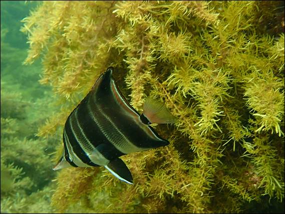 I was now getting too cold to stay in so I slowly worked my way back to shore but kept getting distracted with all the fish I kept spying. Mostly I just watched from above but here is one last snap I took of a fish I see every time I go out. These Truncate Coralfish have always been quick to hide and seem to stay close to nooks and crannies where they can escape too, but not this one: