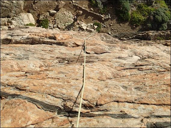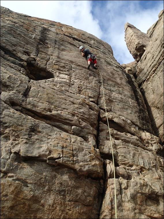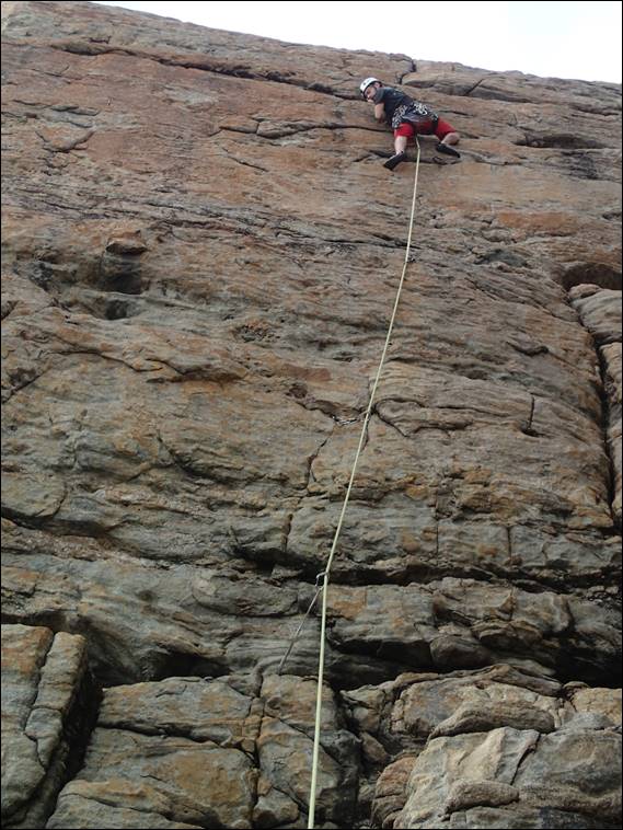 Now yes I was tried but it just didn’t seem right to end on an odd number of climbs, does anyone else think like me? Well I have to admit to slipping up and dropping on my lead by one grade. But, I think I made up for it with the choice of climb which is extremely run out as this image hopefully shows. The run out sections are not too hard, but the holds are fingery and your head does play games when you get +6m above the gear and don’t forget today was a no chalk day: