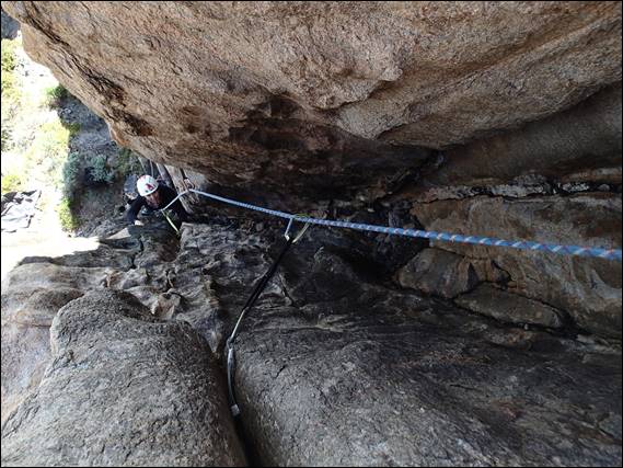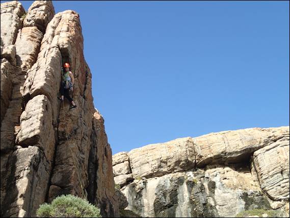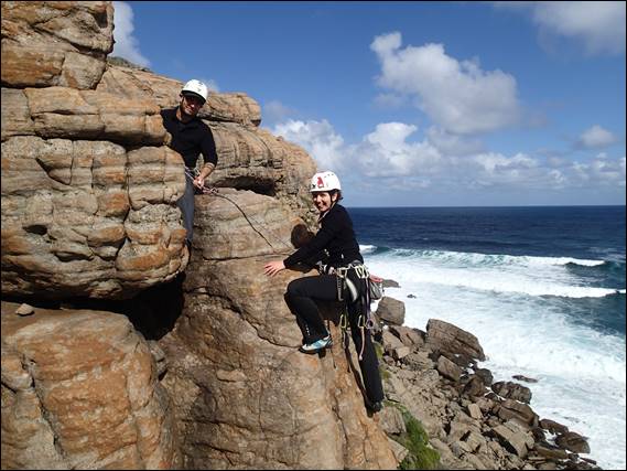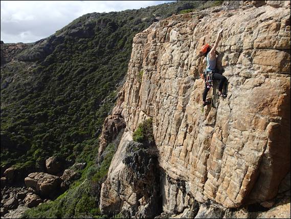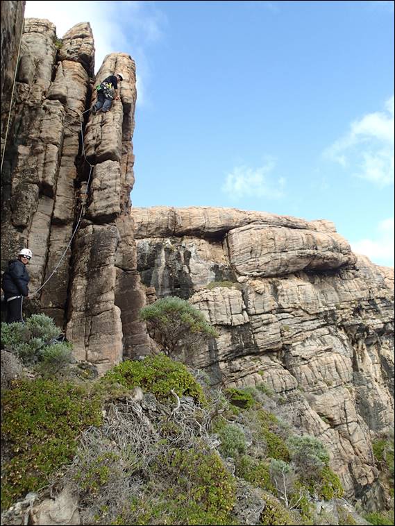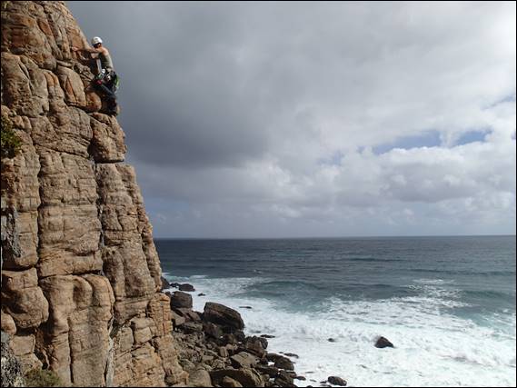 It’s a bit of a bush bash to get to the base of this crag, so we instead of walking in from below we scrambled along the top and rapped in. This made things much easier for descents too. The crag is surrounded by scrub and while we are but a stone’s throw from the main walls of Willyabrup it felt like an isolated and remote spot. Now at some point, and it may as well be now, I need to point out that our reliable local weather/condition guide Kym almost put us off coming down this way. Not from a weather but a condition perspective, we were expecting dampness and salt spray but are happy to say the conditions were tip-top and the friction was faultless: