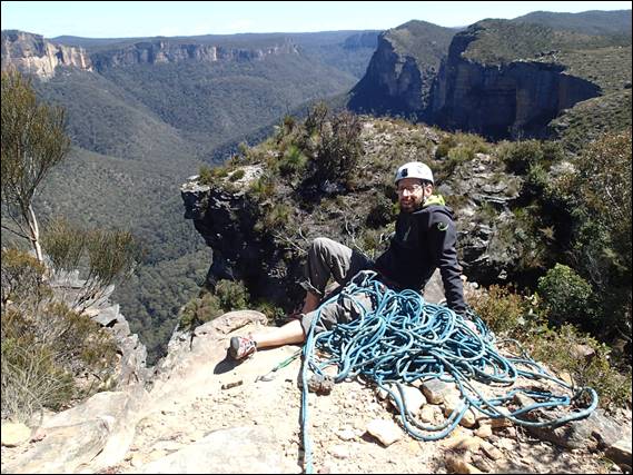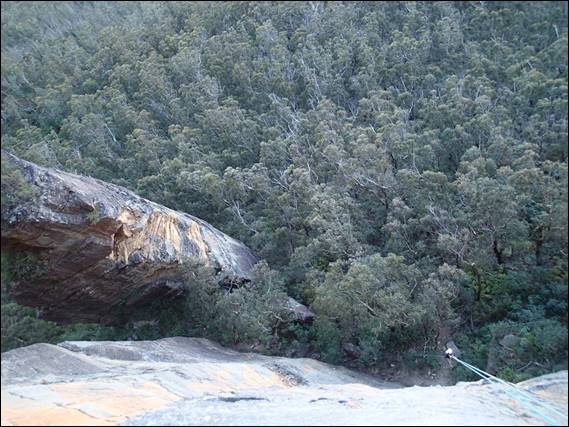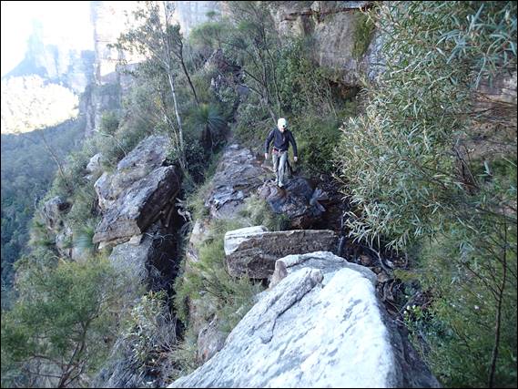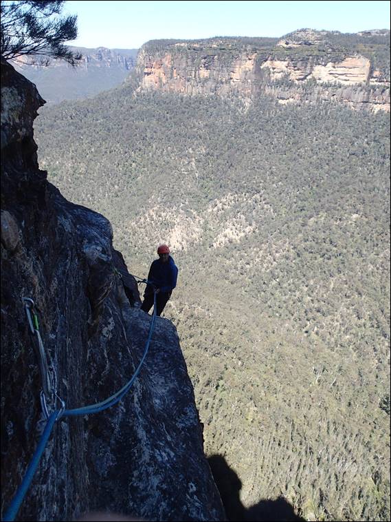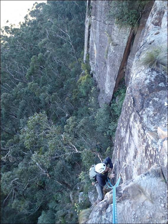 Then it was a walk along lunchtime ledge, quite a long walk but pretty safe as it was good and wide. You may get a glimpse of the scale of this place in the background. We were still 100m above the base of the cliff and above us at this point there was another 40m above us. The day was looking good, a blue sky and not too hot but the wind was threatening to pick up a bit with the promise of gusts of 40km/hr or so: