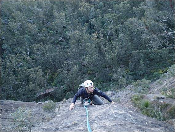 Back at the house we once again had a spot of lunch and warming cup of tea to wash way the worries of climbing in high winds. With the bulk of the afternoon still ahead of us we thought we would sample another local crag, this time heading for Zig Zag which was named after the zig zag path constructed by the convicts way back in the 1870’s. We didn’t know what to expect so walked along the base looking at lines until one jumped out at us, which happened to be Just for Fun and it was. We were learning that a mixed route that had carrots was in most cases full bolted, with carrots. Maybe carrots are considered tread gear over east? Still we were in the bluies and the use of bolts is something to expect: