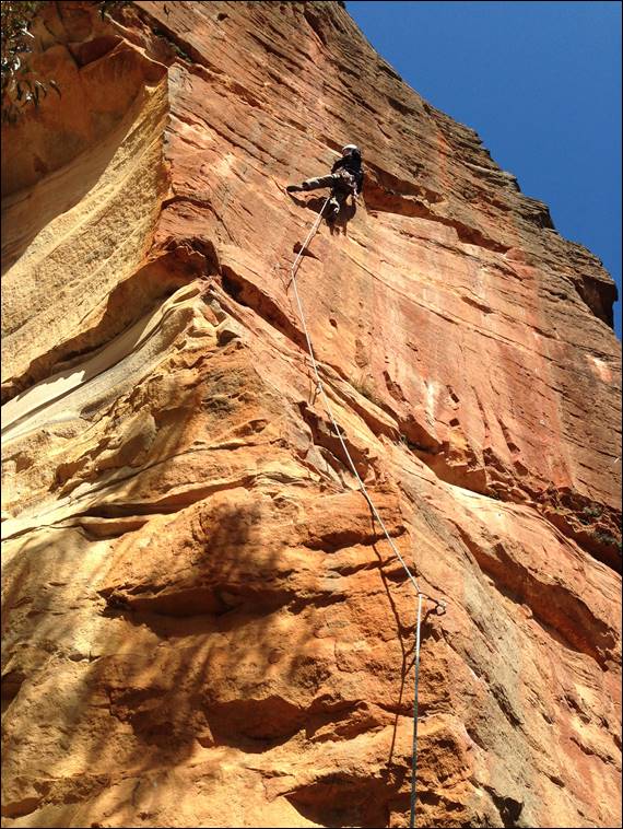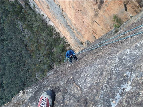 We found the rap station first time with no back tracking required, success so far. I had parent alert going off inside my head so let Rongy take the lead on the abseils, it had simply been way to long since I had been as adventurous as this on an approach. There were two abseils to make both of them would stretch a 50m rope but we luckily had two 60m ropes, unfortunately both singles so we were dragging a bit more weight than needed with us: