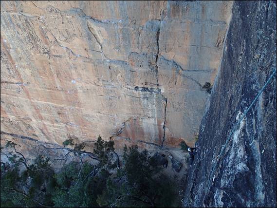 The wind was crazy but the way the crag faced the climb was somewhat sheltered so it added atmosphere but didn’t blow us off. The climb was a pearler, every pitch was storming with the most amazing situations on a hanging arête over nothing but big amounts of space. The rock was again full of ironstone flakes and very enjoyable, this time we had to use bolt plates and a couple of times the bag in which we carried them tipped upside down but we fortunately didn’t lose any. We had considered to go back down to climb Sweet Dreams but with so many people there and the conditions not letting up we bailed and headed out: