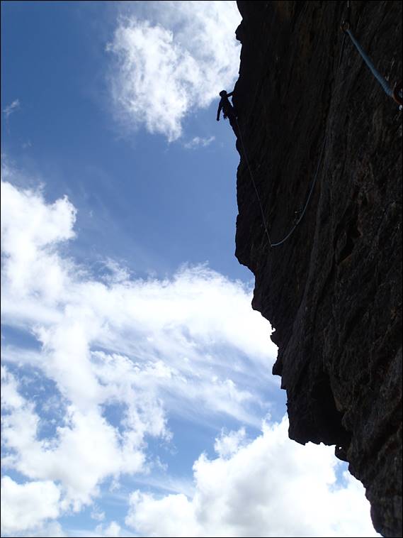 I’ve skipped a few pitches now as we had the scramble pitches, of which only one forced us off rock and onto shaly vegetated slopes. The one that stays on rock while never hard still was great fun and consistent, so we didn’t feel that it detracted from the quality of the climb in any way. So here Rongy is setting off on pitch 6, an impressive traverse into space and then he disappeared round the corner and kept going: