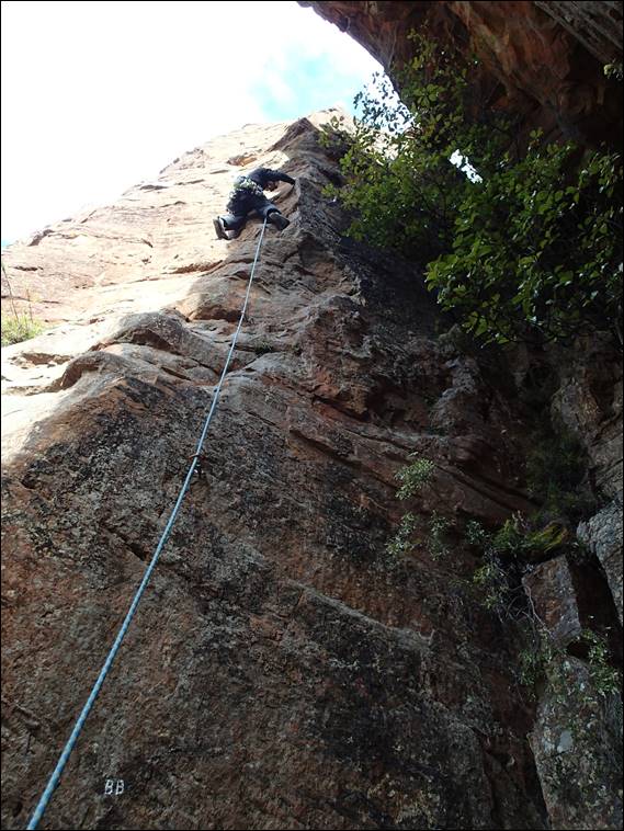 After pulling the ropes we had a short walk along the base to find the start of our climb, by now we had a good all over body warm up. We found a little sign indicating BBB for Bunny Bucket Buttress, a big classic mountain day out that was supposed to have two scramble pitches in its impressive 8 pitch covering 270 glorious meters. I had first lead which involved what many say has the hardest move of the climb right at the start. It certainly was a bit thuggee and even had a glue hold on it, but we will forgive them that: