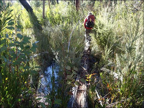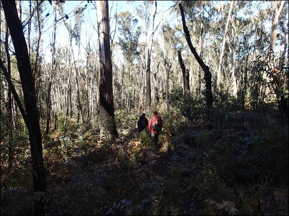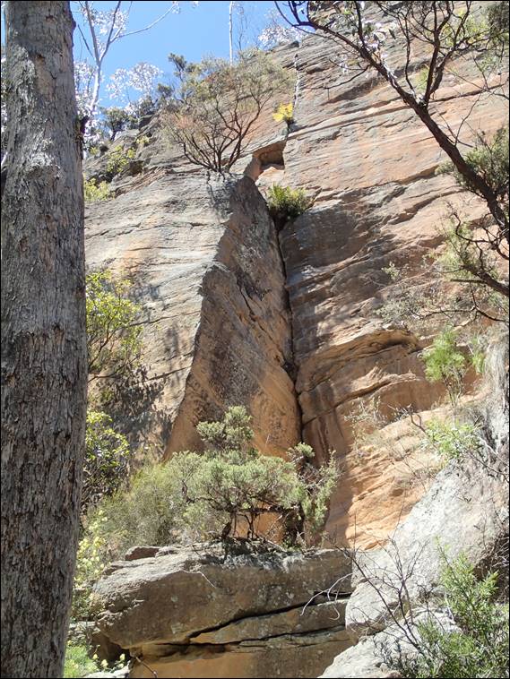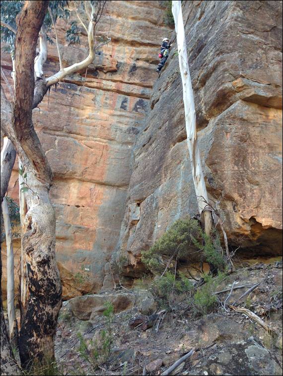 Not being a premier sports crag and having what some consider a big walk in at 25min this place does not get much traffic. So not surprisingly we there the first at the carpark and probably only ones, as we didn’t see anyone else all day. The access goes past residential properties and there has in the past been some issues so they ask that you give the houses a wide berth and keep quite. That was not an issue for us as we made our way through the trees. They had been burnt some time back now and there was lots of regrowth coming up, and the contrasts between the green lush understorey and blackened dead looking trees was striking: