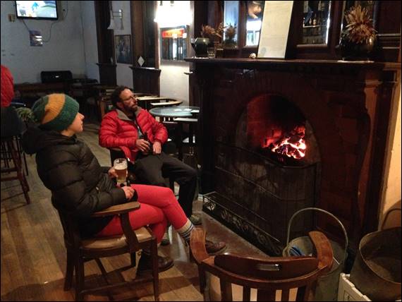 We had already decided that it was about time that we treated ourselves to another pub meal, so after the walk out and a freshen up back at the house we walked down to the local establishment. After another hearty meal we grabbed a second beer and hogged the fireplace to warm up. Despite the lovely day the evening temperatures quickly dropped so we worked on increasing our thermal mass in preparation for the cold walk home: