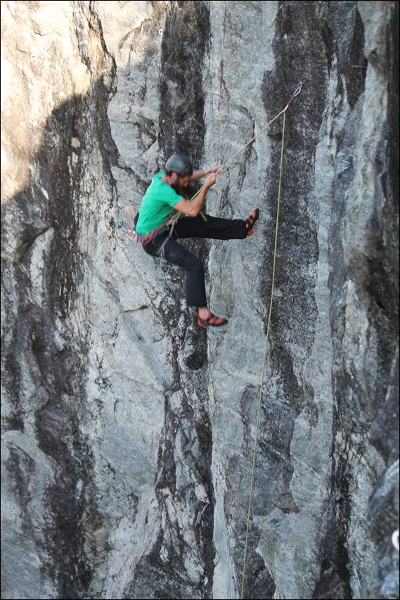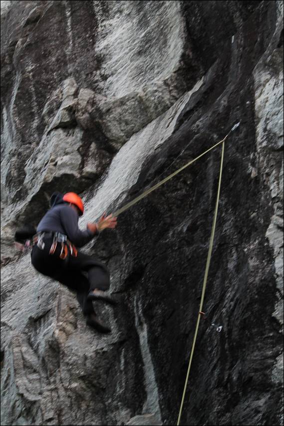 Howsie was up next and he had his sights set on the left hand variant to Attack of the March Flies, and despite feeling spanked after the first two climbs he carried on regardless. Before I rapped down after cleaning the anchors at the top of T3 I decided to hang about and take a few pictures from a different angle. Rongy was doing the right thing as belayer watching carefully until Howsie had clipped the first bolt, why is this relevant… you’ll see later: