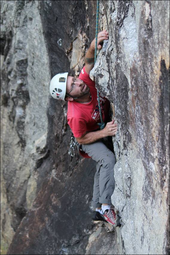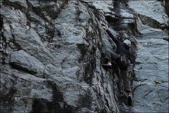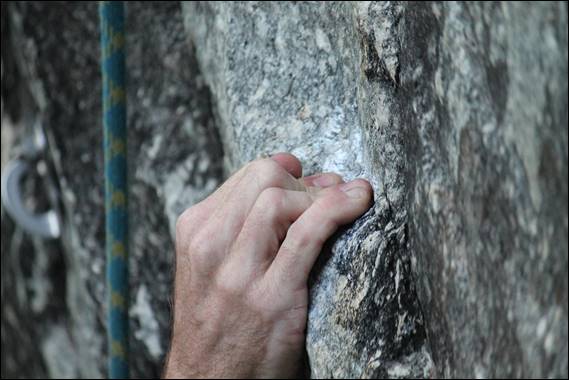 Now I mentioned that the humidity was pretty good this morning, and we have found over the years of climbing here that we can tell if we have a chance on some lines based on this climatic factor. The hard granite doesn’t soak up the moisture and any humidity results in the rock having a slightly slick feel about it compounded by any sweat we may add. When you are relying on holds such as this one, which is the next hold Rongy went for after the position in the above image, on a wall that is slightly overhung it really becomes a make or break factor. The last time I tried this route I just couldn’t stick this hold but today it felt great: