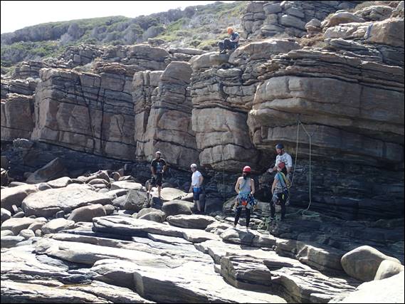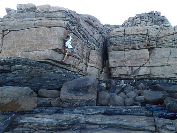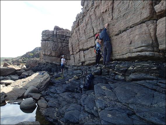 If you read all my emails you will know that the Bookshelf is the ideal beginners place, so why not rehabilitation location for broken climbers who are on the mend?! It involves a lovely walk along the rock coast which some may say is not the best for a stuffed ankle. But having been to two physio sessions, got the low down on what I’ve done and what I can’t do, now wear an ankle brace I felt confident I could take the walk in on. Plus I was wearing something that many of you will not have seen me wear: