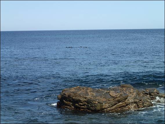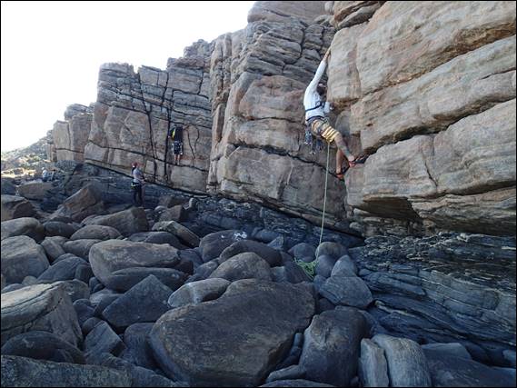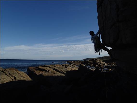 Howsie finally decided to take on the piece de resistance of the Bookshelf, an eye catching roof that is as good as it looks. Up until now I had asked that he use only wires and tri-nuts on lead (cams being allowed for the belay), but with this beast I allowed him to use cams on the lead. For the first time he was not able to on-sight the climb so it was time to check the finger tips, take a few deep breathes and slow down. It was perfect timing as out to see we had a pod of dolphins cruise past: