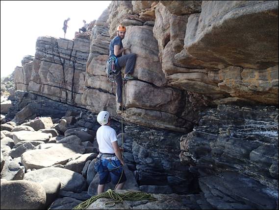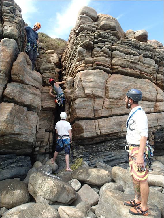 After cleaning up the belay we found Lou doing what she wasn’t supposed to do, leading a route. But that said she had been super sensible and picked a chimney that wasn’t going to pose any risk of a fall, especially the way she wedged herself into it. It was great to see her back on the pointy end and enjoying it (unperturbed by the many watchful eyes):