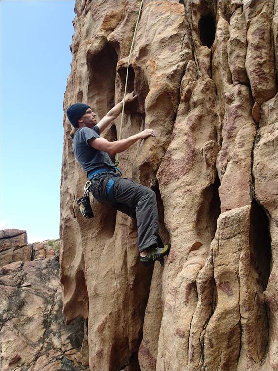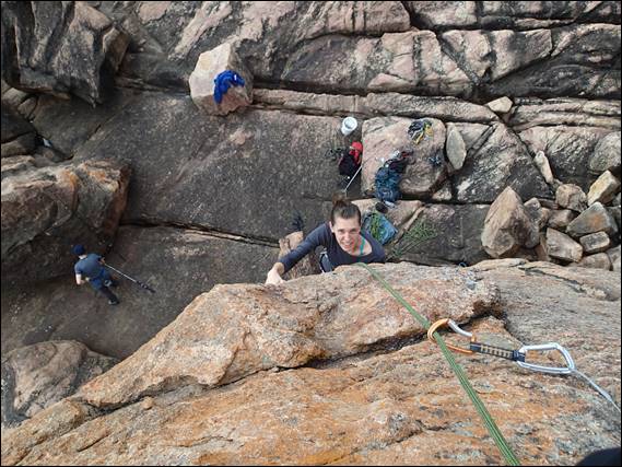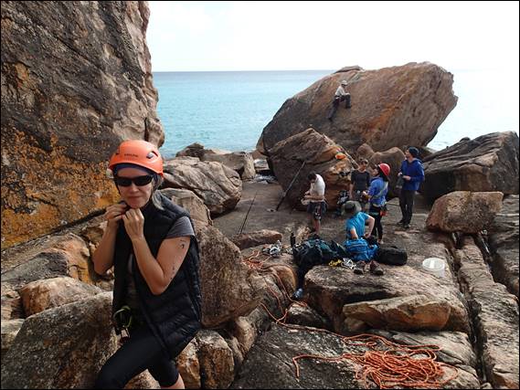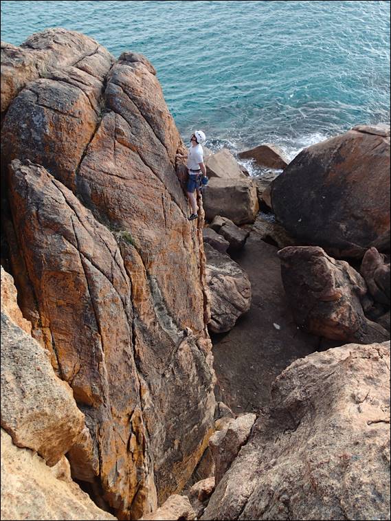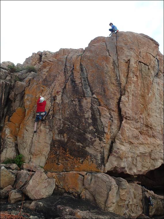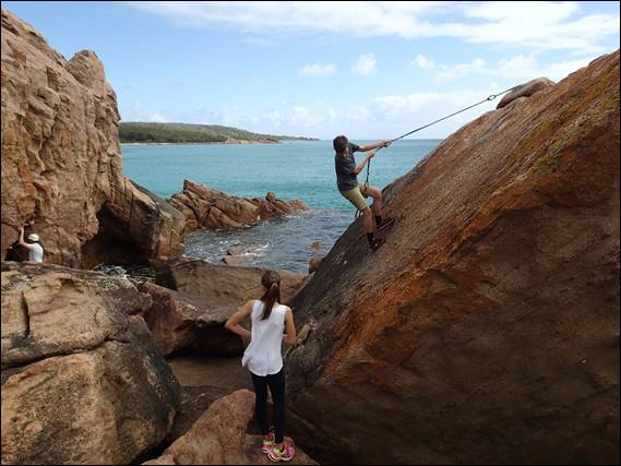Now I mentioned that Elseya was also down, and it’s always easiest if we bring a ‘plus one’. Josh her dance mate loves mucking about on rocks as much as she does so he was the natural choice. In an earlier image you may have seen Steve hanging off this line he put up, which leads to the top of a boulder that is regularly used as a fishing platform. So they mucked about and never did ‘climb’ anything as in put a harness on, but bouldered about heaps: