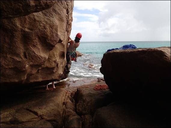 Lou was up for another lead and decided to play on one of the wide cracks at the far right hand end of the crag. These are not listed individually in the guide but mentioned as a whole stating that none are harder than grade 12. One problem with these are that they are often wave washed and Glen duly belayed barefoot as Lou worked out how to start, again and again and again and again: