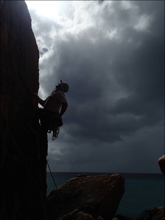 With her shoes she was up and away, it took a bit of time to get into the swing of it and remember how to climb but she was soon up and then back down. Will then jumped on the same line just as it seemed we may get a bit wet. We had missed the wild wind and swell but the rain clouds were whizzing past and occasionally one would sprinkle us. It never lasted too long and the rock here is great and with a good breeze soon dries up: