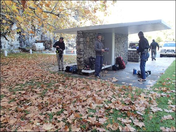 Steve plumped for a more sensible warmup on Raging Torrent while Howsie set off on Savage Sausage Sniffer. Rhys was being a far more attentive belayer than I, as Howsie inched his way up to the first bolt. Not surprisingly no one else was climbing and no families were picnicking, but there were a number of car tourists who did the customary carpark loop stopping long enough to stare at us through their windscreens while in the warmth of their no-doubt air-conditioned vehicles: