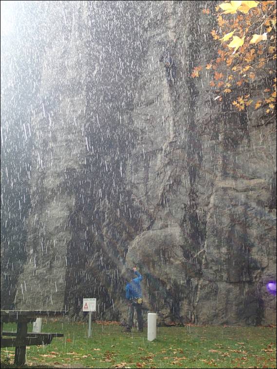 Then as Steve belayed Wiggins the heavens opened big time, if you look carefully you can just make Wiggins out near the top of the quartz layback section. It was never going to last long and the sun poked through a break in the clouds to the west, but above there were still rain clouds dropping their load. This allowed us to capture some great images of the torrent that hit Steve and Wiggins: