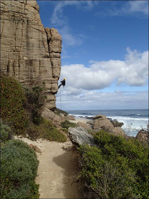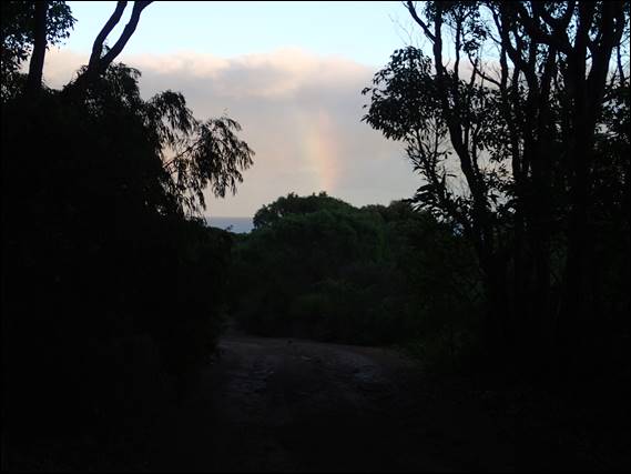 Despite my prediction that we would struggle with the weather in my last email, this weekend has been a flurry of options to get out. There were offers to visit a Perth crag (it was very tempting!), a trip to Welly Dam this morning and yesterday a day of local trad, which is the one I plumped for. I was very lucky to be able to squeeze this trip in, as Elseya has dance and it was going to take up most of the weekend, until they changed some of the session times and that freed up Saturday morning. With trad and longer routes in mind there really was only one option. At the carpark, looking down the track towards the coast, a faint rainbow appeared in front of the bank of cloud we had been looked at as we drove down. A sign that it would be a good day: