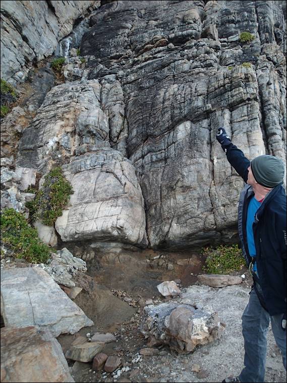 The largest new block at the base we could identify is the one just in front of Steve. This conglomerate block had come from low down on the slab, just above the greenery living in the low crack line. But there were other cleaner blocks that seemed to have come from higher up, which had no doubt dislodged this larger section on their way down. From what we could tell a flake section (two blocks both the size of several car batteries) had come away from the top of the right end of Steel Wall possibly affecting Steel Yourself, but not having ever climbed this route we couldn’t be sure: