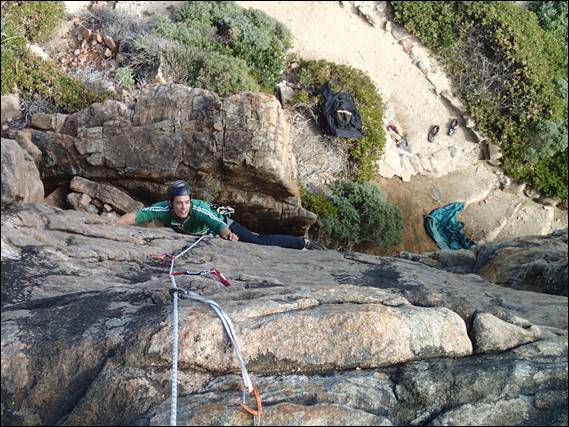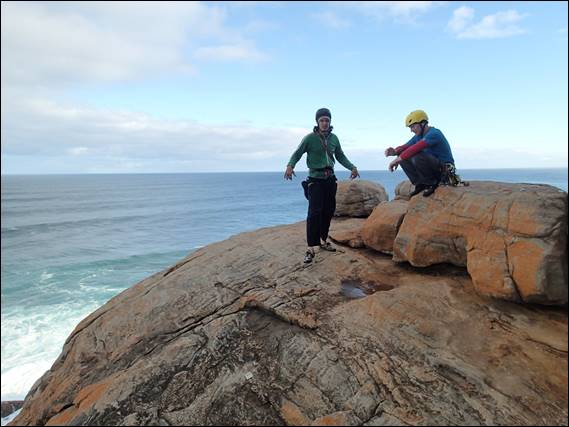 The good news is that I got up clean but not without over tensioning my forearms and shoulders, way more than needed, to compensate for my lack of head space. It was good, as it made me dig that bit deeper and keep going only to be rewarded, like every climb, by feeling good and having a calm moment while sitting at the top belaying the others up. Of course the added bonus of leading here is that you get to sit like a king (or queen) on top of the world looking out at an awesome coastal view: