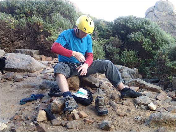 Meanwhile Steve was in self-diagnosis and management mode, the first aid kit was out and the hand was being strapped and immobilised. I’m not sure is he has one foot bigger than the other or whether the pain in his hand was getting worse, as he only managed to replace one climbing shoe with his walking boots. He did grumble so I’m guessing both feet were comfy in their respective choice of footwear and his hand while sore was manageable. Strange the details I pick up as I sit here typing away: