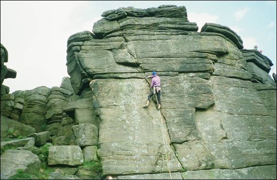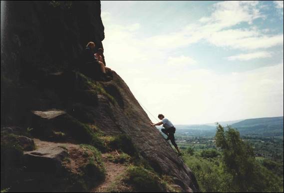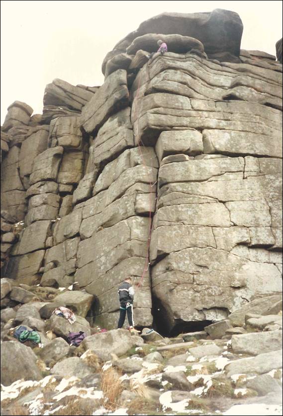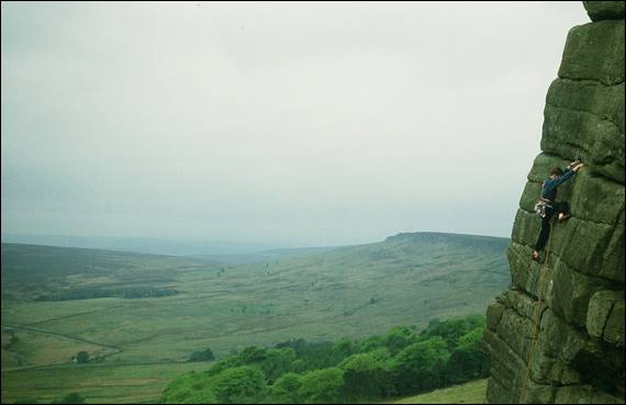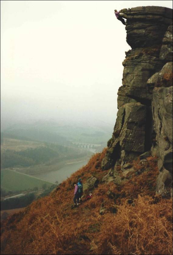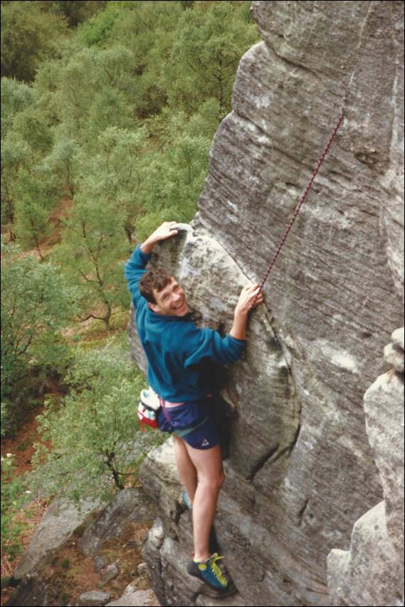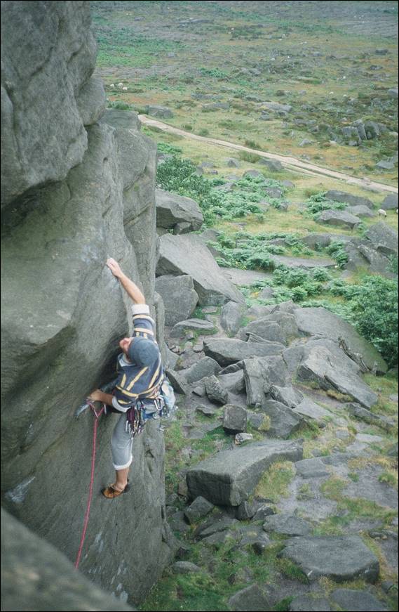 Now another one of our ragged band of merry people was Phil, or to us Phil the Flump. Phil was a walking guidebook in the Peaks, he lived there and knew the crags like the back of his hand. Phil could even provide advice on the type of protection climbs offered. This was made all the more amazing with the fact that Phil hardly ever led anything and never climbed that hard. Below you can just see Phil belaying me on Evening Wall at Burbage North. This edge provides relatively short routes as it horseshoes round the top of Burbage Valley, the routes to the south are harder and far bolder and while we went there a few times we more often went to the northern areas. Before I led the route below I had jumped onto Ash Tree Variations, a line that was protected by a gymnastically move which took some thinking out. After getting up it one of the non-climbers who had tagged along that day asked to have a go and instead of admitting defeat he continually jumped up and down on the rope shouting at me to take in and then claiming he had climbed the route. I was pretty angry watching my rope get abused like that and Phil saw it, so took me off to the side and allowed me to channel the energy into leading a few good lines. Thanks Phil: