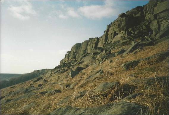 While researching for this email I noticed that Burbage Edge was listed on the UK Climbing website as being a Yorkshire crag. Until now I felt like I had only once climbed on Yorkshire grit, and in truth feel that the grit at Burbage is more akin to the Derbyshire stuff. The one time I did climb on Yorkshire stuff was on a bouldering weekend. I went with a few lads from Mile End climbing wall, Finton was one but I can’t recall the names of the other two. It was a wild and windy Friday night as we drove up the M1 with visibility down to tens of meters, but once again the diligent checking of the forecast paid off. I can’t remember or locate the boulder fields we went too but can vividly remember the much sharper crystals of Yorkshire grit. It was brutal. We climbed for two days and went hard hitting many problems, and by the end our fingers were trashed. I had blood seeping from seven finger tips and the rubber from my new shoes had been sliced to the leather. It was a great trip but I never ventured back to taste any more of that unforgiving rock. Coming back to the Peaks I feel like I haven’t particularly talked up any of the climbs listed so far. It is hard to pick out the standout lines I did as there are just far too many absorbing and consistent routes I’ve done. However, below I have come up with four routes from Stanage that I would rave about starting with Hargreaves Original Route. This slabby route with shallow rounded horizontal breaks is awesome, with enough gear to make it feel safe (with modern gear) the slab keep you on your toes. I liked this one so much I did it a few times and even was known to solo it, it is certainly up there on the hit lists and better still provides for a wicked image with the mighty Stanage stretching out behind: