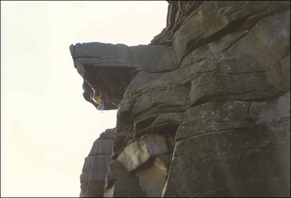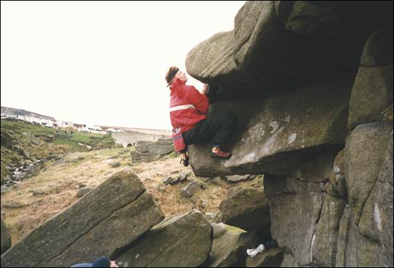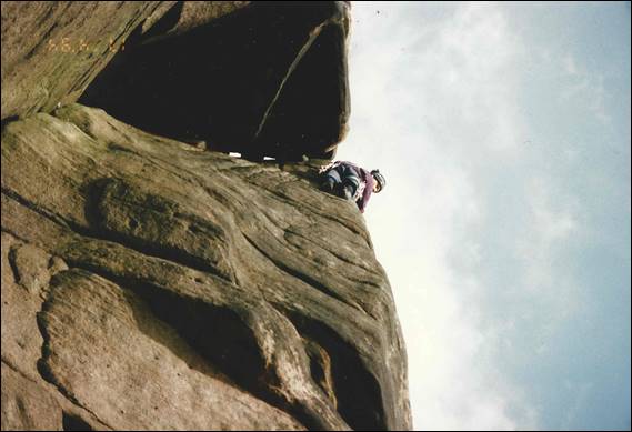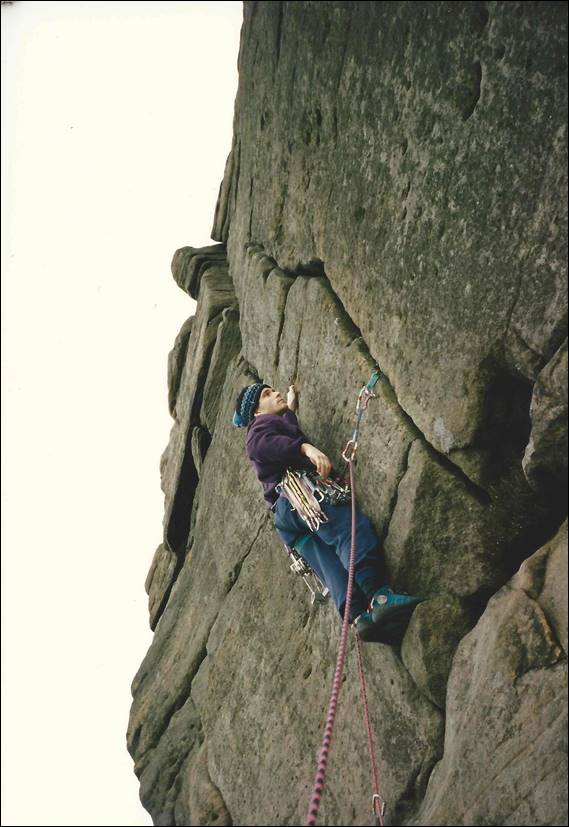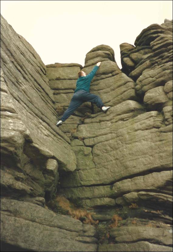 While I am back at Burbage North I have to include the following image of this Romanian boulder I called Joe, on Wobble Stone. I managed somehow to agree to taking up a group of three Romanian climbers whose English was wanting but not as much as my non-existent Romanian! They were boulders not that we had bouldering mats back then, so once again there was not much use of the ropes. This trip stood out for several reasons but mostly that we slept in a barn loft across the road from a pub. I hadn’t heard of it before but they knew about it so I went along with it. It really was a just a loft of a small barn filled with straw, you crammed in with your sleeping bag and put your head down for the night. To get out you had to climb over anyone between you and the small door that was at one end, before climbing down a ladder. It was hilarious and unfortunately I can find no trace of the pub or these sleeping quarters on the internet today so maybe it is no more. I did pull the ropes out for one climb on this trip, and picked The Grogan. A feisty thin finger crack which I can almost claim that I had soloed as my belayer didn’t really know what they were doing. Then when they followed me up they hadn’t a clue how to take gear out so it was highly amusing. Needless to say the rope and gear then went away and we all stuck to bouldering and had a blast: