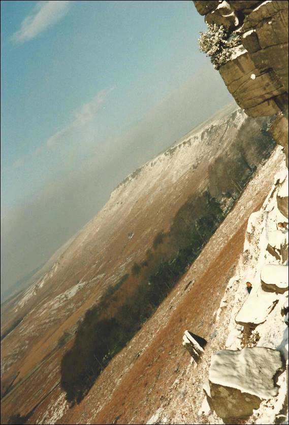 It was not often there would be big whiteout and when it happened so unexpectedly it felt all the more special. On that weekend when we awoke to find everything covered in snow there was not much else to do but go walking. We would usually go away for a weekend prepared for any weather but that said I was able to endure most stuff in my woolly hat, buffalo and baggy bottoms. So instead of brooding in a café or pub about not getting out climbing we would along some of the tracks and ridges and then eat and drink our fill next to a roaring fire. There was also some poly bagging to be done, the cheap version of sledging. With not much between you and the ground this often led to bruised backs and bums when we tried it on rutted farm tracks. We would also wander into the village of Hathersage, which The Plough is on the edge of, to go into Outside. This climbing/outdoor shop had it all and we would browse the many wares always coming out with something we were not intending to buy, as a result weekends like this tending to get more expensive than others. Hatherage happens to be the name of the first route in SW WA that I attempted but backed off, as I was soloing it. Like the climb I named The Plough it is located at Moses Rocks: