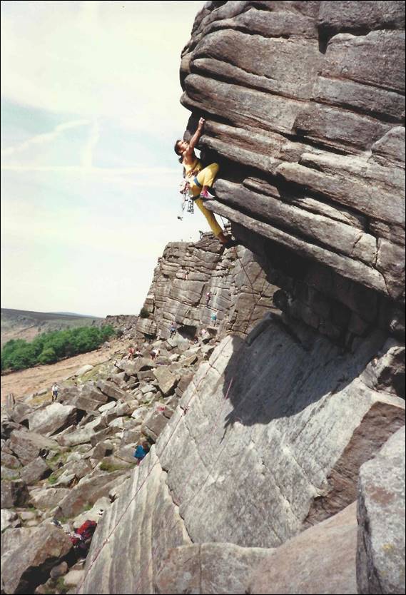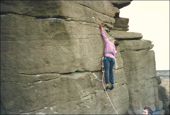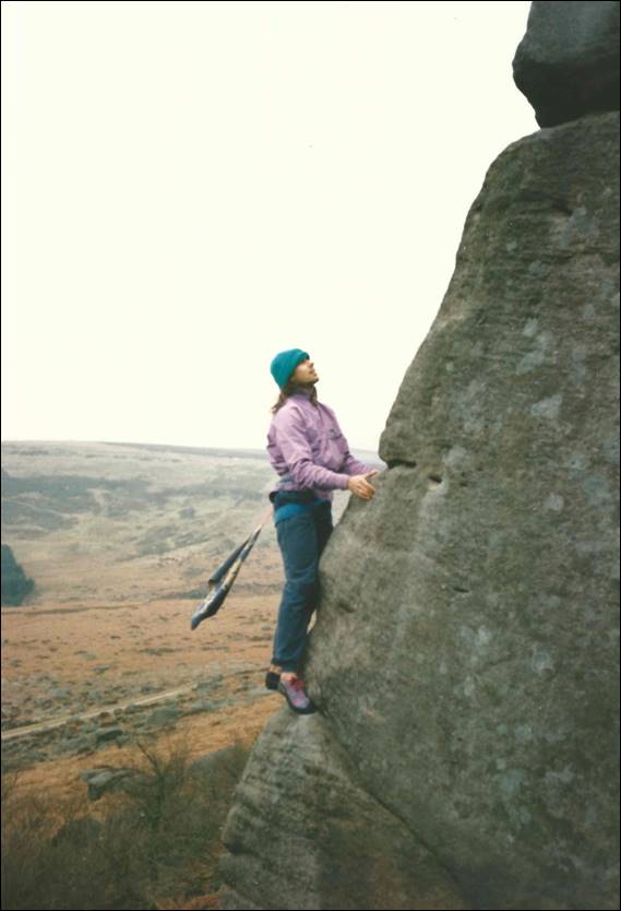 There was a bit of a night scene in the Peaks and a few pubs had late night venues where the music would be pumping and beer flowing. Tom liked his night life, he wasn’t a climber and didn’t like mornings, and when I stayed at their place we would often end up stay out longer than I would normally. Tom didn’t drink and was a willing taxi service for us, but he would also be the one who wanted to stay out as late as possible so we were at his mercy to. Some mornings were fuzzy and on those occasions I’d be even more grateful for having Bamford Edge to be able to walk to from their place. On one such occasion Phil and Sue were not up for climbing but fancied some fresh air, so we hiked up there. I couldn’t help myself from soloing the classic and uncharacteristically long route of the edge, Gargoyle Flake. A great hugely exposed line that builds with momentum and requiring utmost faith in the gargoyle or chicken heads at the top lip. Phil was not too impressed with me on that day, with grumblings of my recklessness. Now just to prove the nick names I’ve been referencing were not just reserved for blokes Sue was known to us as Chockstone Sue: