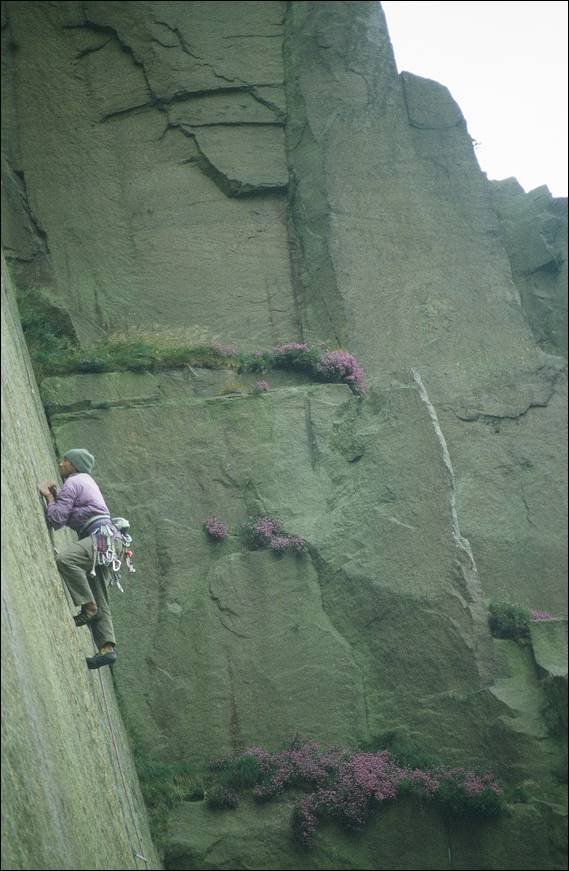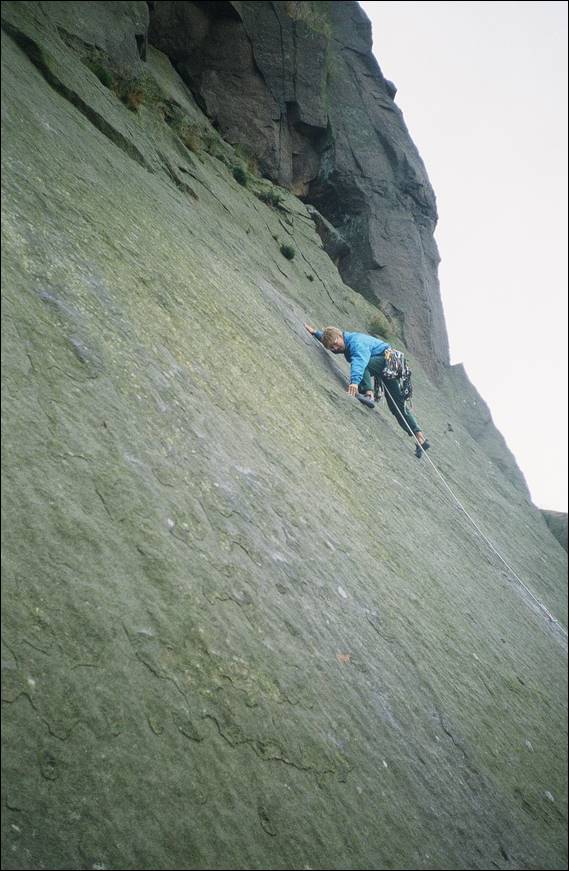 With so many places to climb in the Peaks there are of course those that got away, and some that I really wish I had climbed at more often. One of those places was Millstone Edge, the premiere quarry in the Peaks with many quality routes some of which that are unnaturally long for the area. The clean sheer faces resulting from quarrying activities have left stunning arêtes, faces, slabs and crack lines. The reason I never did much here was that it was intimidating and mostly hard, too much so for most of my climbing partners. However, on one trip with Vince, Sheridan (remember Left Wall in North Wales) and a third person who was the person I climbed with, but can’t remember his name. It was yet another one of those trips where we drove through driving rain to get here, and during the nights it poured down onto the tents. However, daytimes were OK and on one of them we went to Millstone. It was a bit damp and while the wind was biting cold it dried the rock quickly. I was on fire and we gobbled up a number of great lines. This was the first lead I did here which Sheridan then led after me. The Great Slab is never too hard but poorly protected (remember the Peaks is a no bolt area you either have the guts to do it or back off) making it a slow and steady lead, but oh so good:
