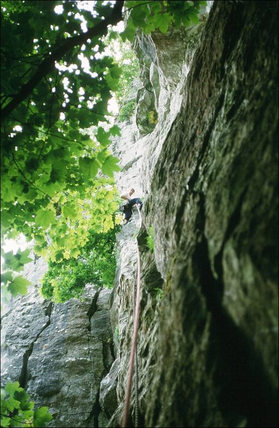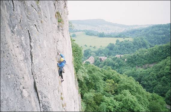 As promised now for something different, limestone. There are many great limestone crags in the Peaks and I don’t recall them ever being as busy as the gritstone crags. That is probably a good thing as the limestone here is softer than that found at Swanage and would soon become polished, looking at the websites now it seems that some of these crags are indeed getting that way. One crag we sampled was Stoney Middleton a real roadside crag and one with a reputation, I went there with Vince when a group of us did a manic road trip that took in the Roaches, Peaks and North Wales in three days. I was a bit of a sucker and if anyone was willing to get out I’d drive despite the distance. The line we picked was polished and grim and the experience didn’t encourage me to return there. I also frequented Wildcat Crag and Willersley Castle Rocks both of which are excellent, nice long routes of 40-50m in tranquil settings on good rock with great gear. We had heard a horror story of how the week before we first sampled Wildcat Crag a woman had to be helicoptered off after she fell and caught her wrist in a crack and was dangling from it after breaking it. I still shiver at the thought of the pain she must have been in. On a lighter note below Sheridan is leading the Sycamore Flake at Willersley Castle Rocks: